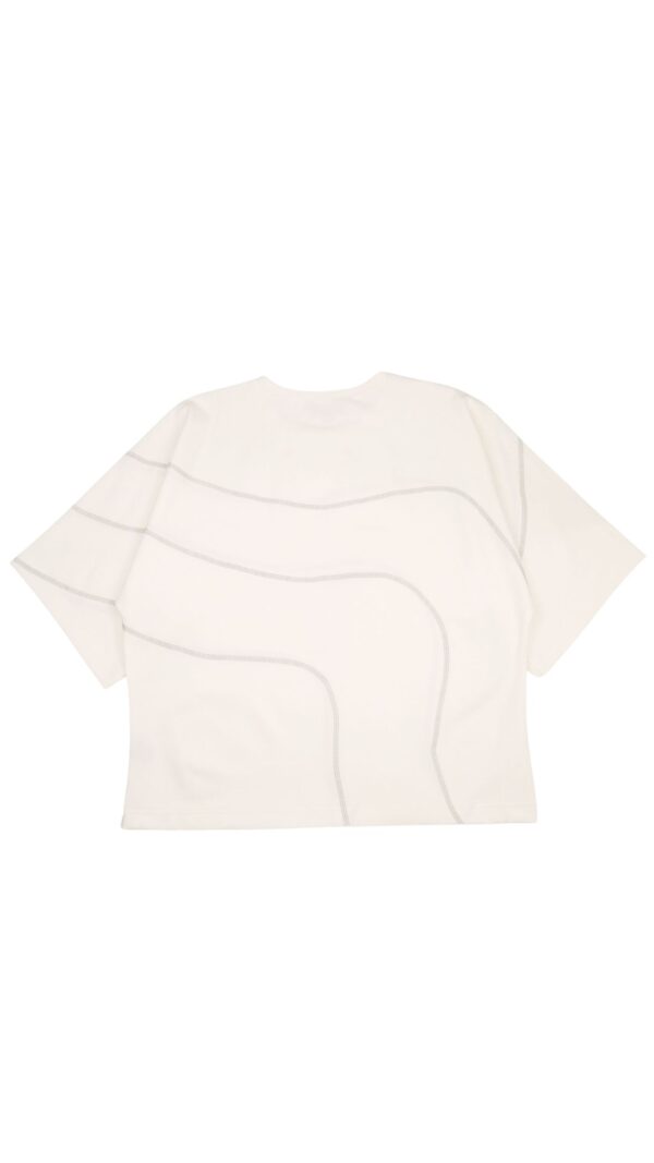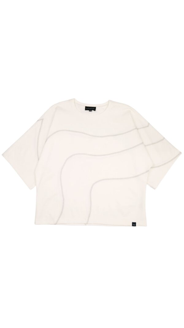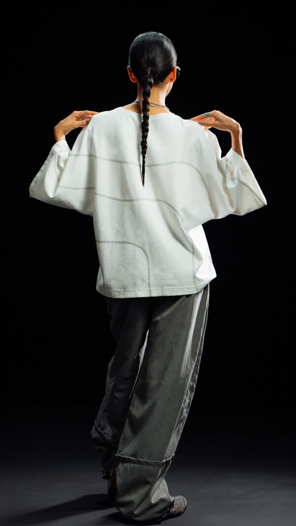Camiseta oversized/boxfit con manga amplia y cuello redondo minimalista. Costuras visibles en forma de curvas orgánicas inspiradas en la cartografía de los Farallones de Cali